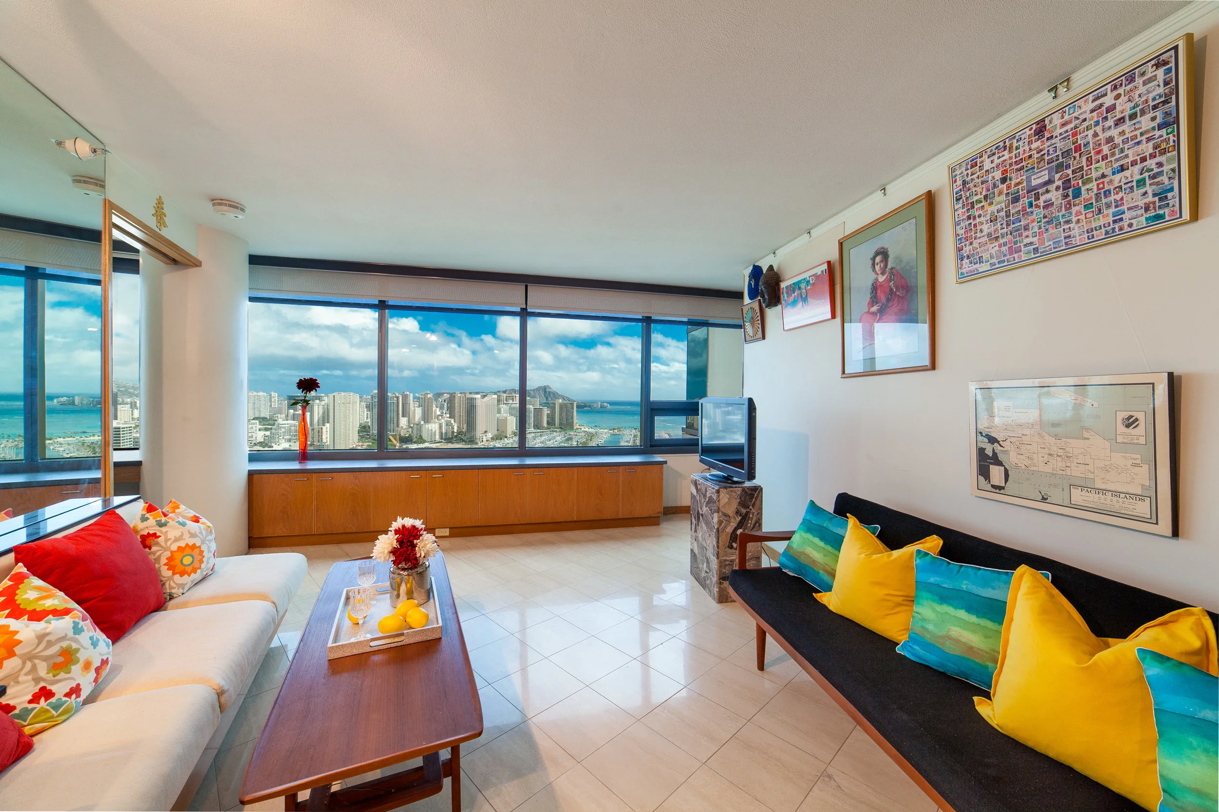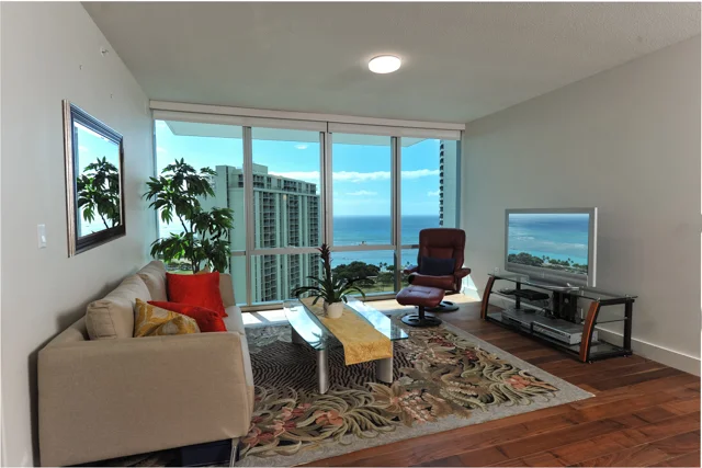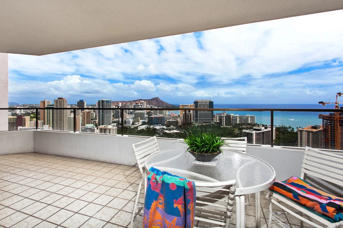 This high floor almost penthouse level condo has a HUGE 284 Sq Ft lanai perfect for admiring views over Ft DeRussy Park, Diamond Head, the ocean and expanded living for Al Fresco dining! A little over 1100 Sq Ft of interior living, this condo has two LARGE bedrooms with en suite bathrooms and comes fully furnished. Convenient to Waikiki & Ala Moana for shopping & sunbathing are the advantages to living here. New wood flooring in LR & MBdrm, new paint in LR & a renovated kitchen w/granite countertops!